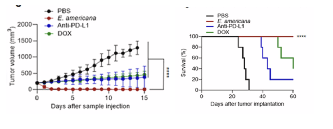 No tumor growth in the E. americana-injected mice (left graph, red line) and 100% survival rate (right graph, red line). Again, no toxicity or adverse effects on major organ systems.