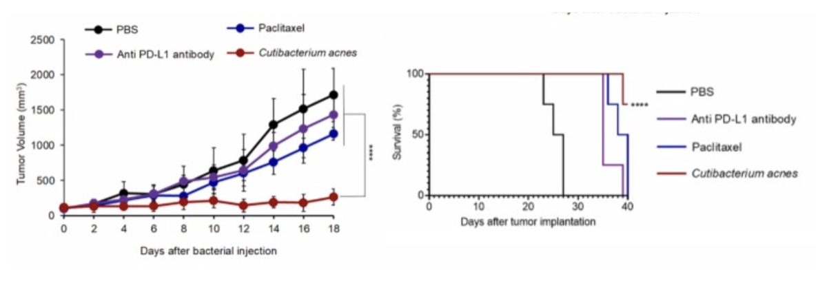 The red line on the first graph (left) above shows the work of the C. acnes in a game-changing moment. The bacteria was able to arrest the tumor progression, which became more impressive when compared against a placebo (PBS/black line), best-in-class immunotherapy with broad clinical adoption (Anti PD-L1 antibody/purple line), and standard chemotherapy (Paclitaxel/blue line).