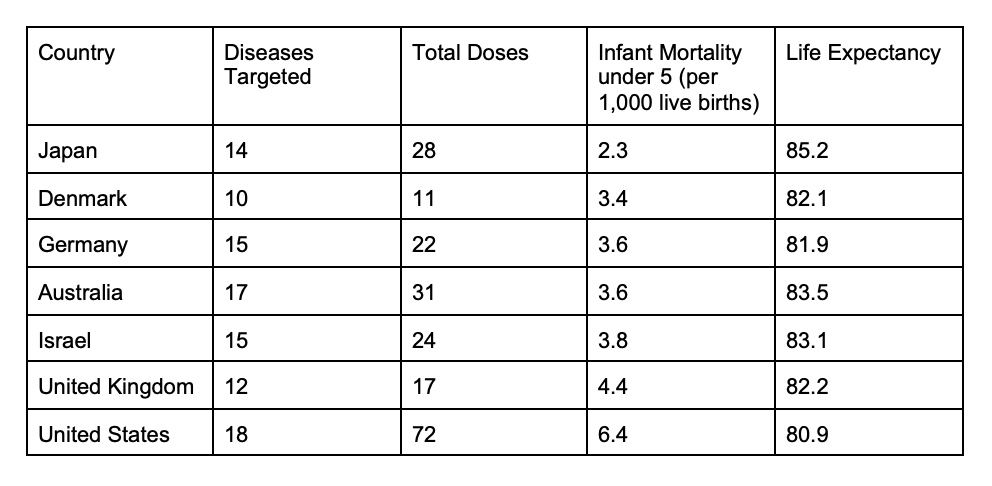 Below is a chart with vaccine schedule data alongside infant mortality rates from UNICEF data and life expectancy rates according to the CIA, including Israel and Australia. The data is sorted from the lowest infant mortality (under 5) rate to the highest.